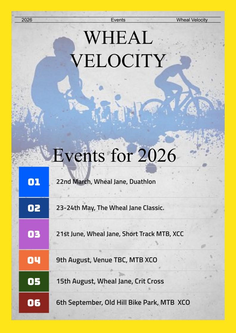 Here are the events which will be run by Wheal Velocity this year.